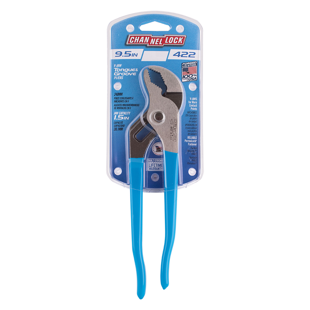 Channellock 422 9.5” Tongue & Groove Pliers have a unique v-jaw design that creates more points of contact on round stock and tubing. These pliers are built to last with a Permalock fastener to eliminate nut and bolt failure, patented reinforcing edge to minimize stress breakage and laser-hardened teeth to provide a better, longer lasting grip. Channellock V-Jaw Pliers are made in USA and forged from high carbon U.S. steel that is specially coated for ultimate rust prevention.