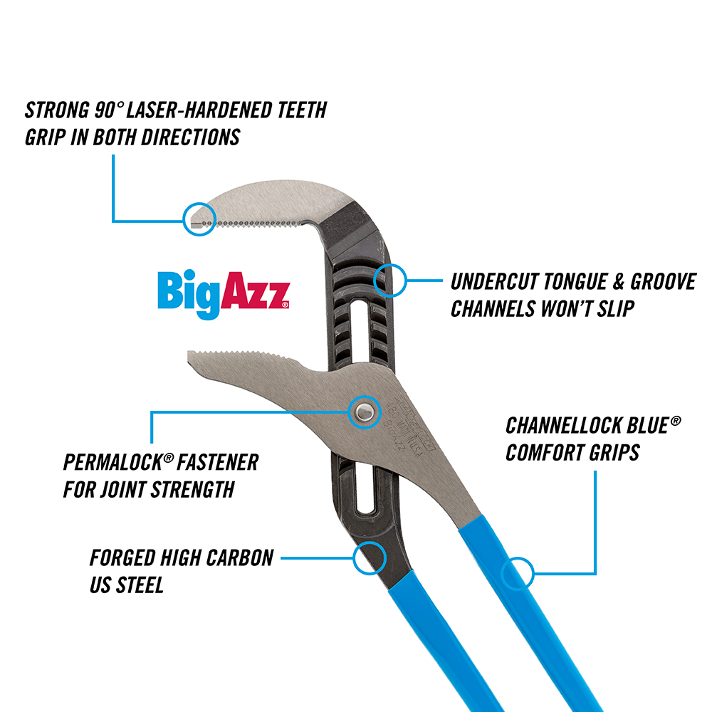 Channellock Straight Jaw Tongue & Groove Pliers are built to last with a Permalock fastener to eliminate nut and bolt failure, patented reinforcing edge to minimize stress breakage and laser-hardened teeth to provide a better, longer lasting grip. Channellock Straight Jaw Tongue & Groove Pliers are made in USA and forged from high carbon U.S. steel that is specially coated for ultimate rust prevention.