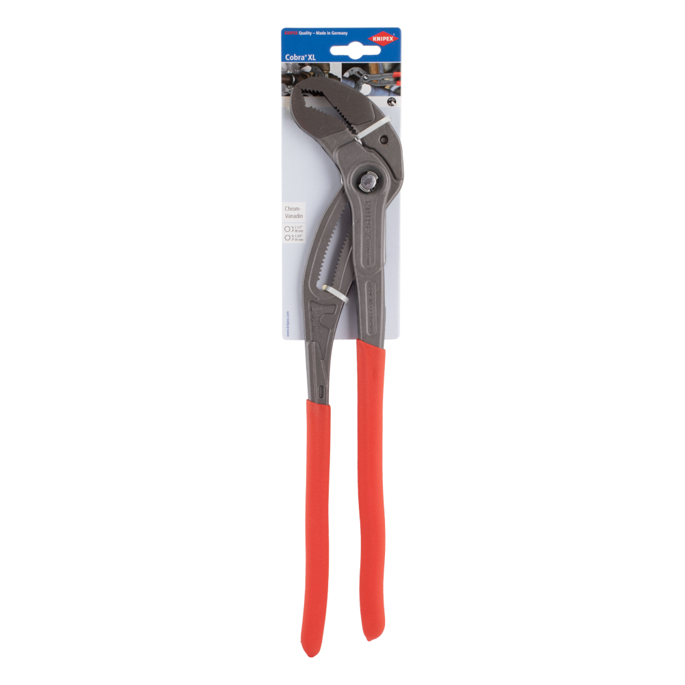 The Knipex Cobra® XL Water Pump Pliers revolutionize gripping with a remarkable blend of power and lightweight design, surpassing traditional pipe wrenches. Swift push-button adjustment directly on the workpiece eliminates unintentional slipping, and fine-tuning adapts seamlessly to diverse workpiece sizes. Self-locking on pipes and nuts ensures a secure hold with minimal handforce. Hardened teeth with a hardness of 61 HRC offer outstanding wear resistance. The box-joint design enhances stability, and a pinch guard protects operators' fingers. Crafted from chrome vanadium electric steel, forged, and multi-stage oil-hardened, these pliers embody durability and precision for efficient and comfortable use.