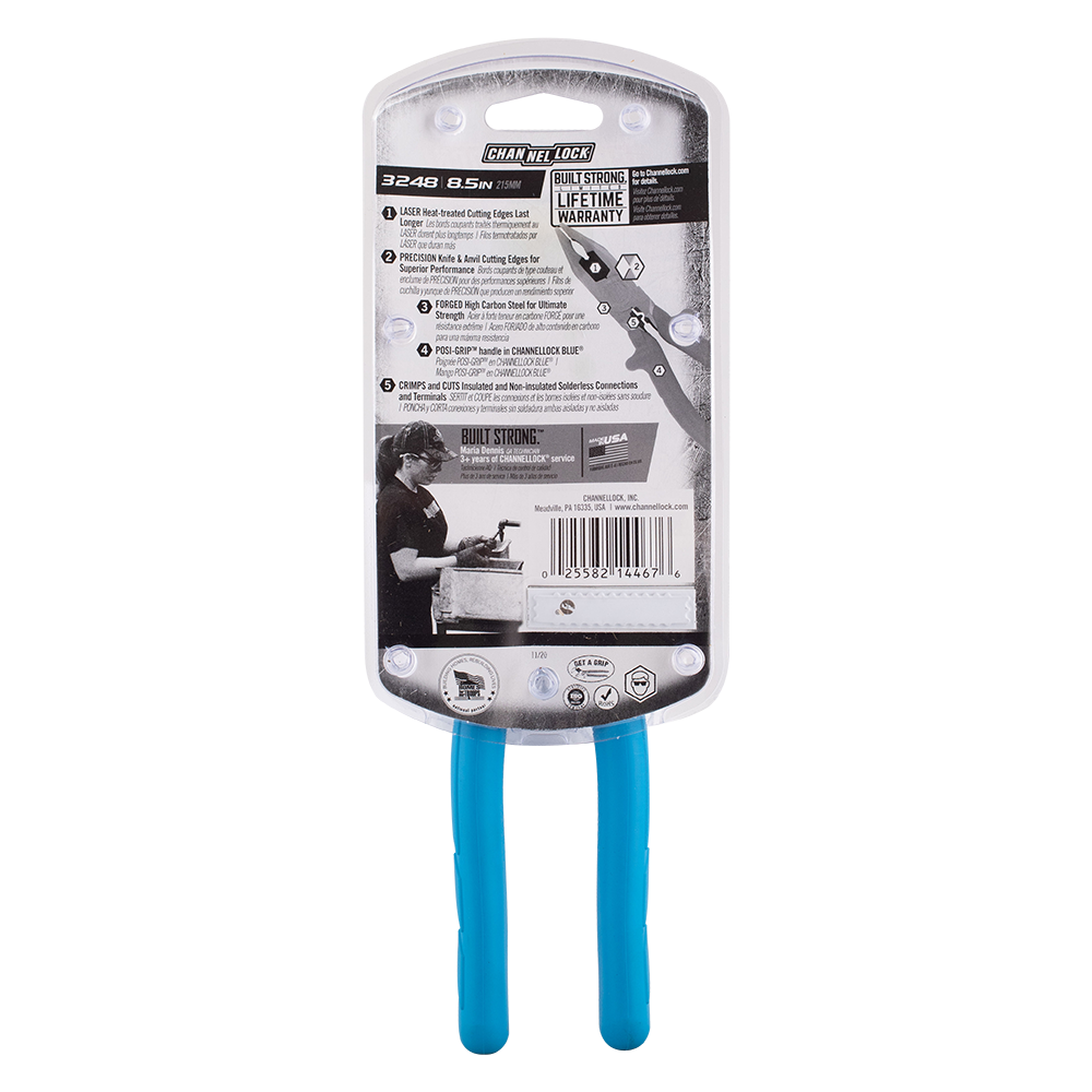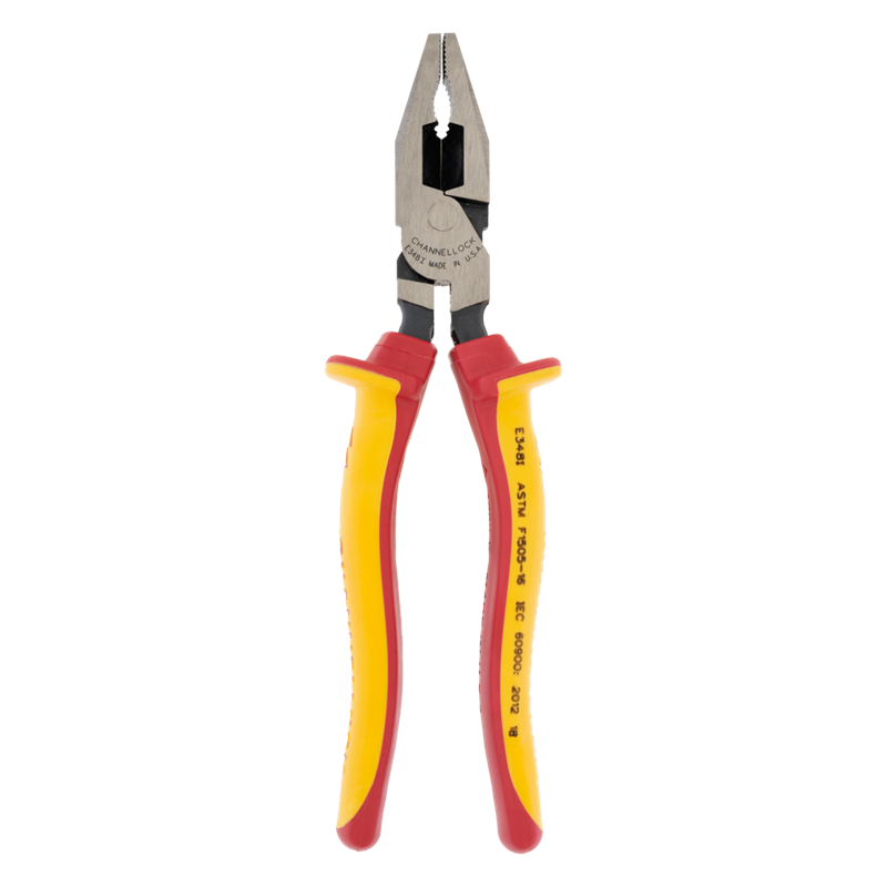 Channellock Posi-Grip™ Linesman Pliers are designed for ultimate strength and performance. Featuring laser heat-treated cutting edges, these pliers ensure superior durability, lasting longer than standard alternatives. The precision-machined knife and anvil style cutting edges provide perfect mating, enhancing both efficiency and longevity. Crafted from forged high carbon steel, they deliver exceptional strength for tough tasks. The distinctive Channellock Blue® 1000V POSI-GRIP™ safety handle ensures a safe and secure grip, also making it easy to crimp and cut insulated and non-insulated solderless connections and terminals. 100% made in USA.