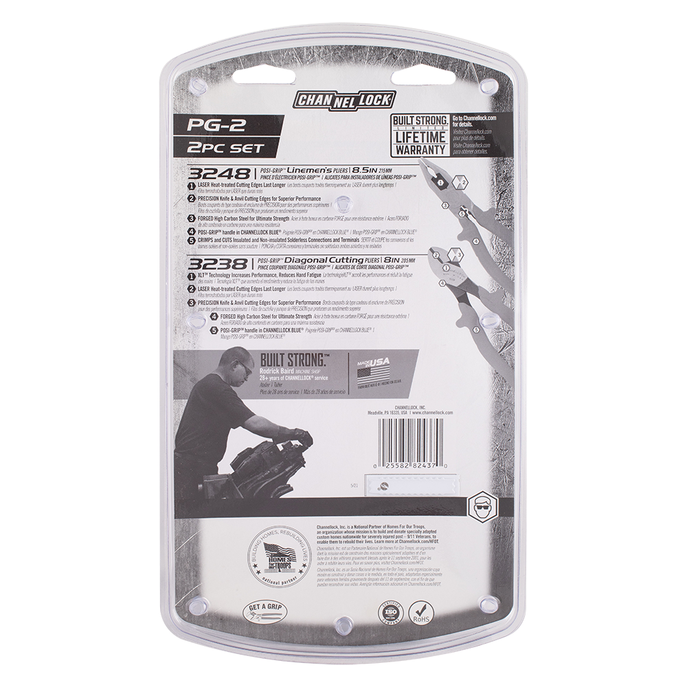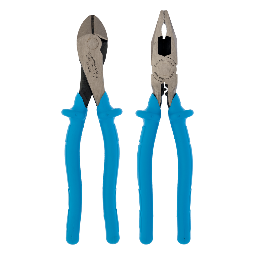 The Channellock Posi-Grip™ Linesman and Diagonal Cutting Plier Set offers exceptional strength, durability, and precision. Both tools feature laser heat-treated cutting edges, ensuring longer-lasting performance. The Linesman Pliers are perfect for crimping and cutting solderless connections, while the Diagonal Cutting Pliers utilize Xtreme Leverage Technology (XLT™) for enhanced cutting power with reduced hand fatigue. Crafted from high carbon steel, these pliers are built for tough jobs and unmatched strength. The iconic Channellock Blue® POSI-GRIP™ handles provide superior comfort and control. Proudly made in the USA.