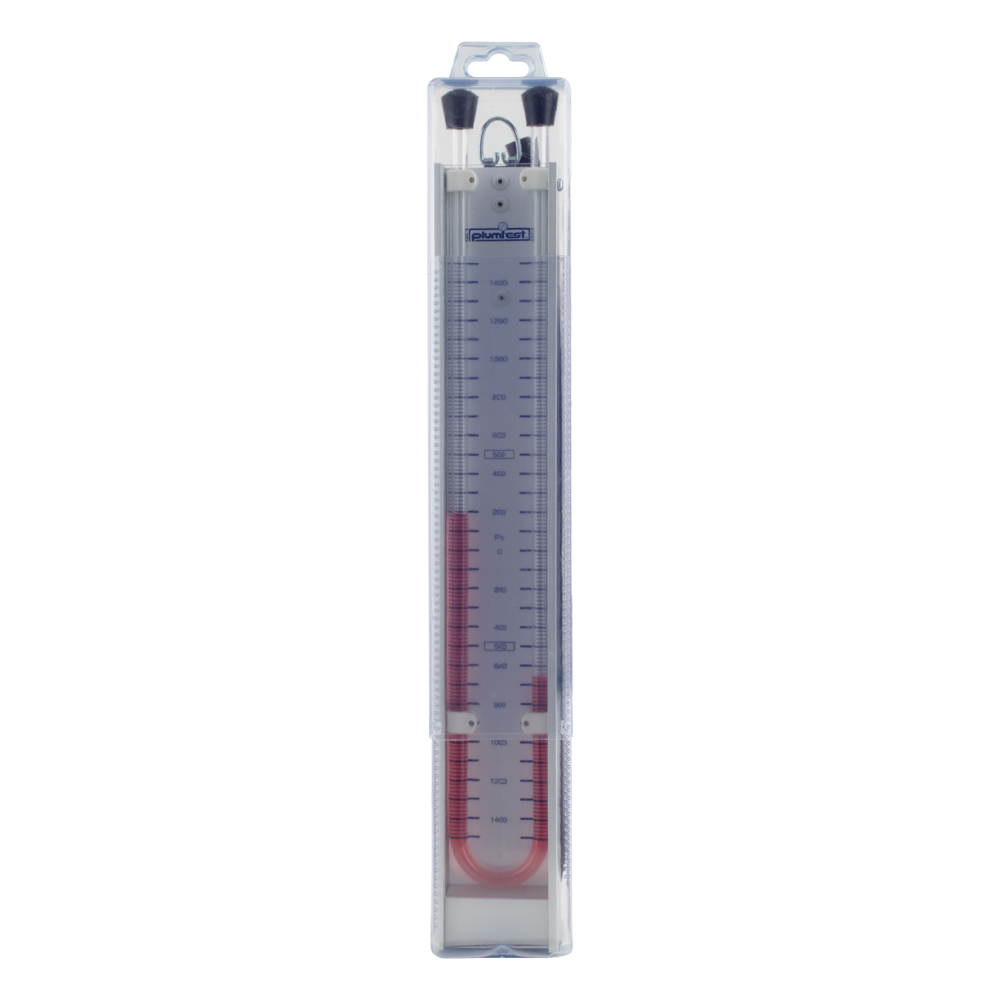 The Plumtest Manometer is designed for durability, featuring a robust aluminium frame and a strong protective cover that safeguards its calibrations. It is capable of testing up to 3kPa and includes a rubber connecting hose. The manometer's magnet, riveted to the back of the case, allows easy attachment to appliances. Additionally, it comes equipped with a wall hanging ring for convenient storage. The manometer fluid (PT1311) is available separately, ensuring accurate readings and optimal performance.