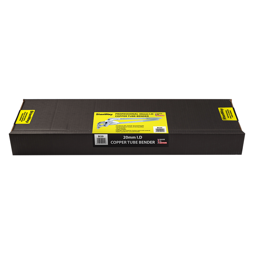 The StanWay Professional Copper Tube Benders are suitable for use with Hard and Half Hard Copper Tubes. This bender can make 30°, 45°, 60° and 90° Degree Bends which can be formed by bending firmly to the respective indicators on the forming head. An extremely strong alloy is used on the bender head and fork to ensure a long life and light weight. Knurled handles assist grip; making the bender easy to control. The two handles readily separate for quick loading and also allow for working in confined spaces. The nylon guide ensures a smooth finish. Made in UK.