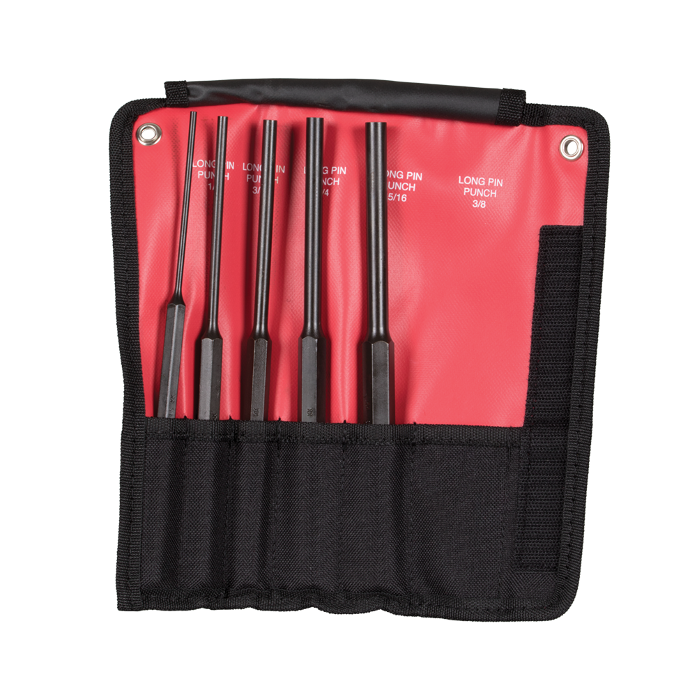 5 Extra long series (8 inch) Pin punches with a hex shank and black oxide finish for rust protection.