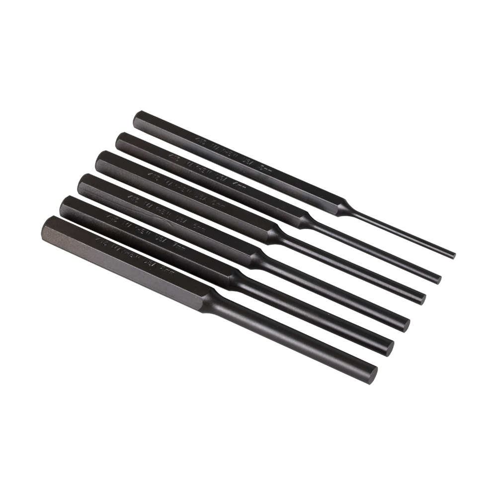 6 Parallel pin punches that feature a hex shank and supplied in a pouch.
