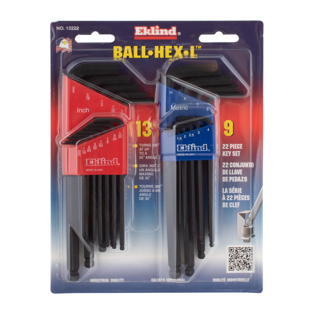 This Eklind Long Series Ball Hex L-Key Combo Pack is crafted in the U.S.A. with Eklind® Alloy Steel, heat-treated for optimal strength and ductility. Finished with a durable Eklind® Black Finish, the set resists rust, ensuring long-lasting use. This combo pack includes two sets: a 13-piece Imperial set and a 9-piece Metric set. The keys are colour-coded, with red for imperial sizes and blue for metric sizes. The set includes 22 keys in sizes ranging from 1.5mm - 10mm and 0.05" - 3/8". Eklind® Ball-Hex Keys allow you to drive a fastener at up to a 30-degree angle. A plastic holder securely holds each key in a marked slot, providing easy access and organisation for professional-grade performance in industrial settings.
