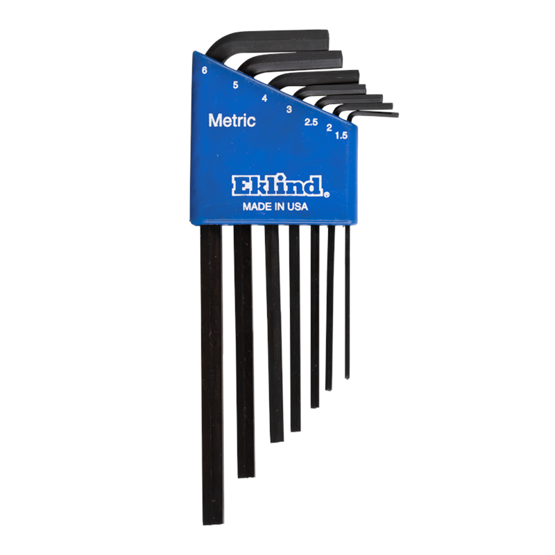 This Eklind Long Series Ball Hex L-Key Set is crafted in the U.S.A. with Eklind® Alloy Steel, heat-treated for optimal strength and ductility. Finished with a durable Eklind® Black Finish, the set resists rust, ensuring long-lasting use. Color-coded in blue for metric sizes, it includes seven keys in sizes ranging from 1.5mm - 6mm. Eklind® Ball-Hex Keys allow you to drive a fastener at up to a 30-degree angle. The plastic holder securely holds each key in a marked slot for easy organisation and access.