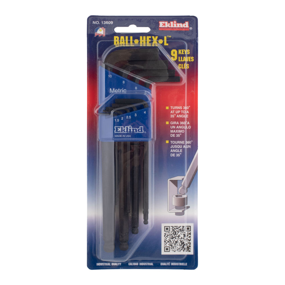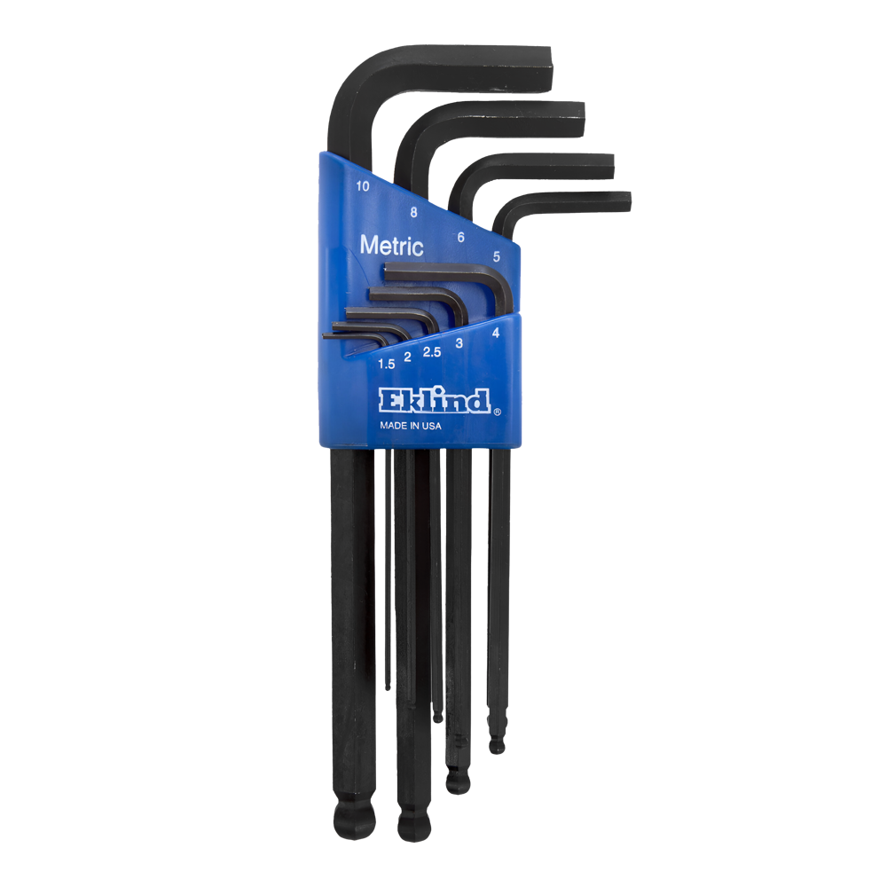 This Eklind Long Series Ball Hex L-Key Set is crafted in the U.S.A. with Eklind® Alloy Steel, heat-treated for optimal strength and ductility. Finished with a durable Eklind® Black Finish, the set resists rust, ensuring long-lasting use. Color-coded in blue for metric sizes, it includes nine keys in sizes ranging from 1.5mm - 10mm. Eklind® Ball-Hex Keys allow you to drive a fastener at up to a 30-degree angle. The plastic holder securely holds each key in a marked slot for easy organisation and access.