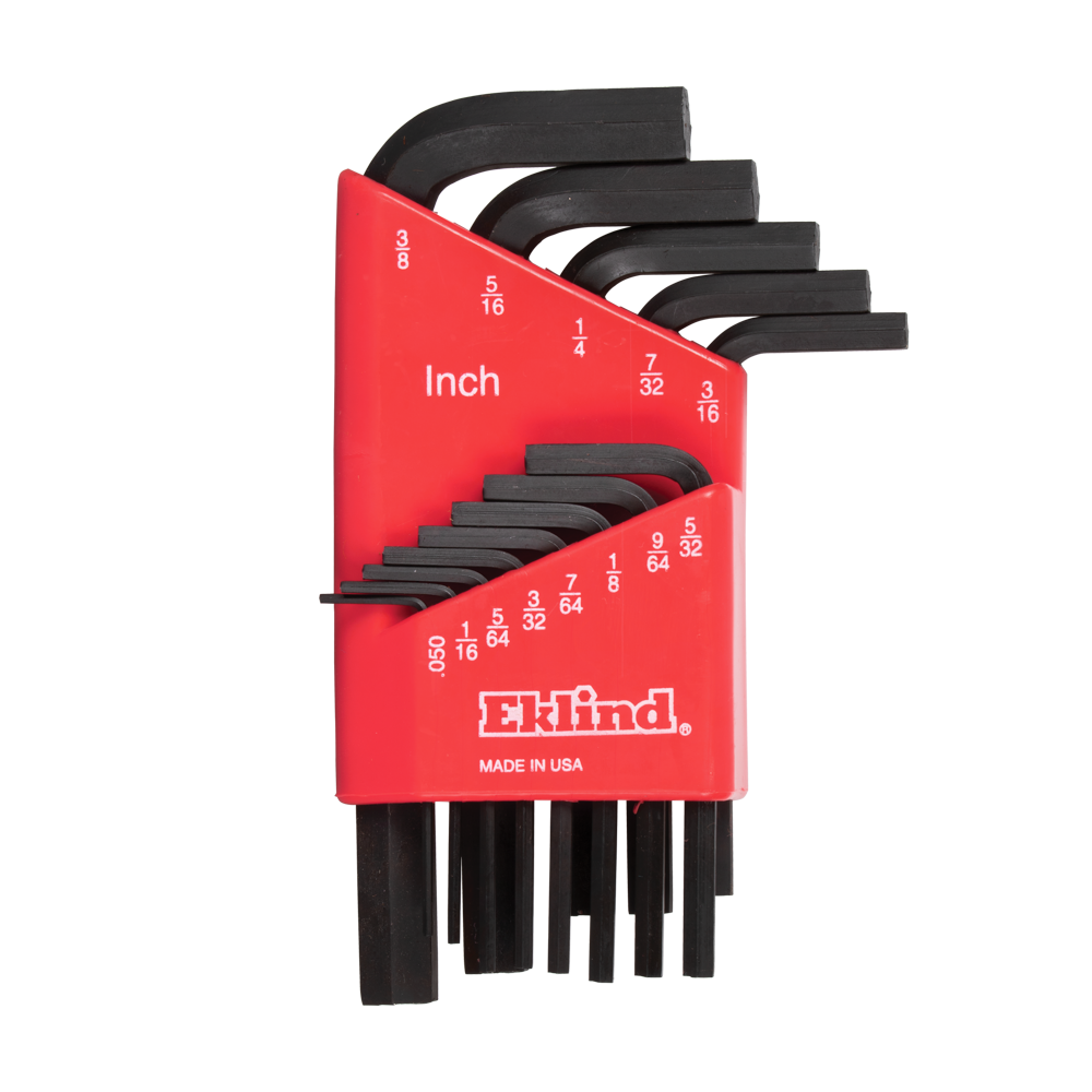 This Eklind Short Series Hex L-Key Set is crafted in the U.S.A. with Eklind® Alloy Steel, heat-treated for optimal strength and ductility. Finished with a durable Eklind® Black Finish, the set resists rust, ensuring long-lasting use. Color-coded in red for imperial sizes, it includes thirteen keys in sizes ranging from 0.05" - 3/8". The plastic holder securely holds each key in a marked slot, providing easy access and organisation for professional-grade performance in industrial settings.
