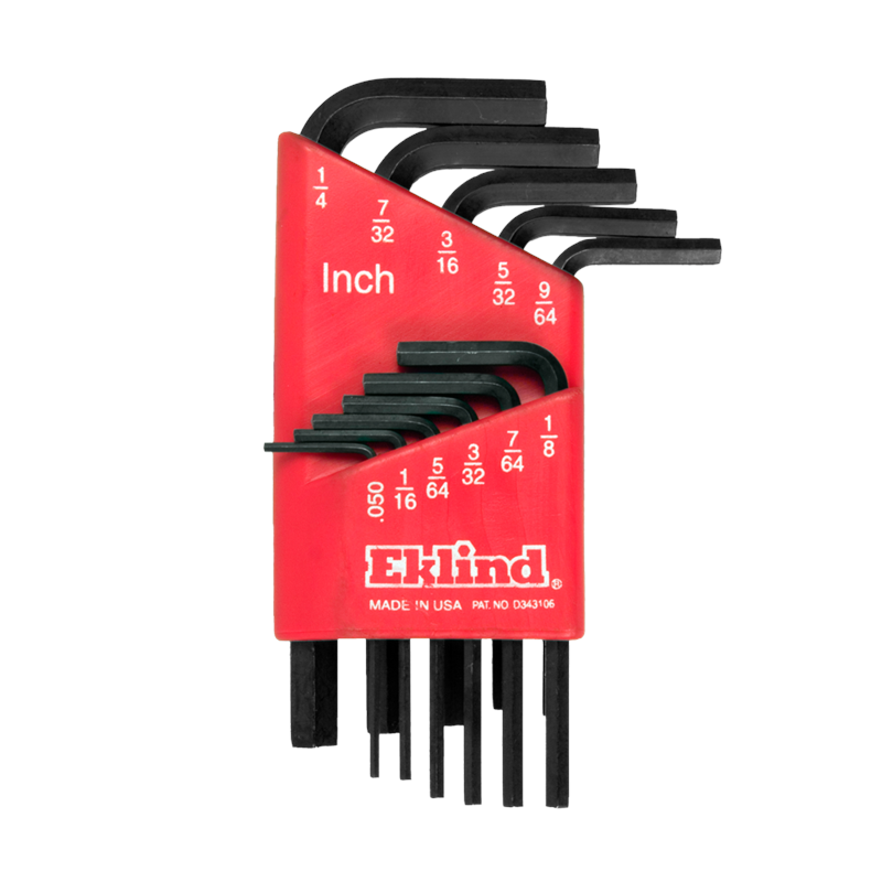 This Eklind Short Series Hex L-Key Set is crafted in the U.S.A. with Eklind® Alloy Steel, heat-treated for optimal strength and ductility. Finished with a durable Eklind® Black Finish, the set resists rust, ensuring long-lasting use. Color-coded in red for imperial sizes, it includes thirteen keys in sizes ranging from 0.05" - 3/8". The plastic holder securely holds each key in a marked slot, providing easy access and organisation for professional-grade performance in industrial settings.