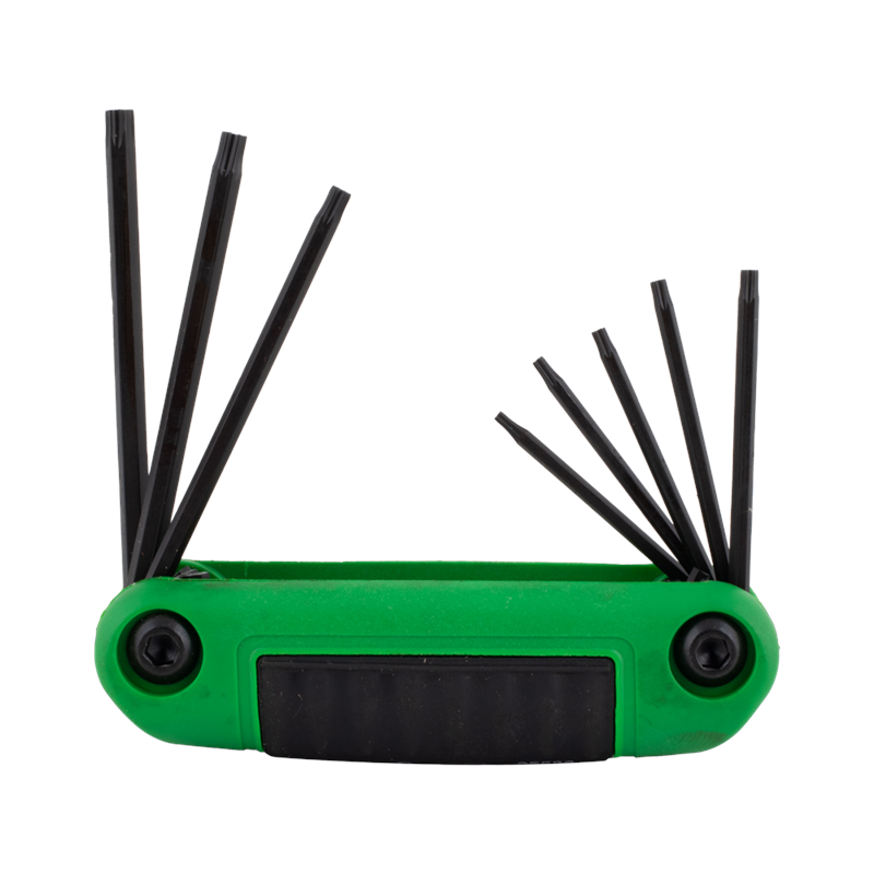 The Eklind Ergo-Fold™ Torx Security Key Set is made in the U.S.A. using high-quality Eklind® Alloy Steel, heat-treated for superior strength and ductility. With its Eklind® Black Finish, the set resists rust and wear. Security (Tamper Resistant) Keys have a hole in the tip to accommodate a pin in the socket head fastener. The fold-up design includes a variety of popular sizes in one convenient handle, preventing the loss of individual keys. Fold a key out to a right angle for maximum leverage or fully extend it to operate like a screwdriver. The ergonomic handle, featuring a hard plastic shell and soft over-mold, ensures comfort, slip resistance, and safety. The set is colour-coded green for torx sizes, offering an efficient tool solution.