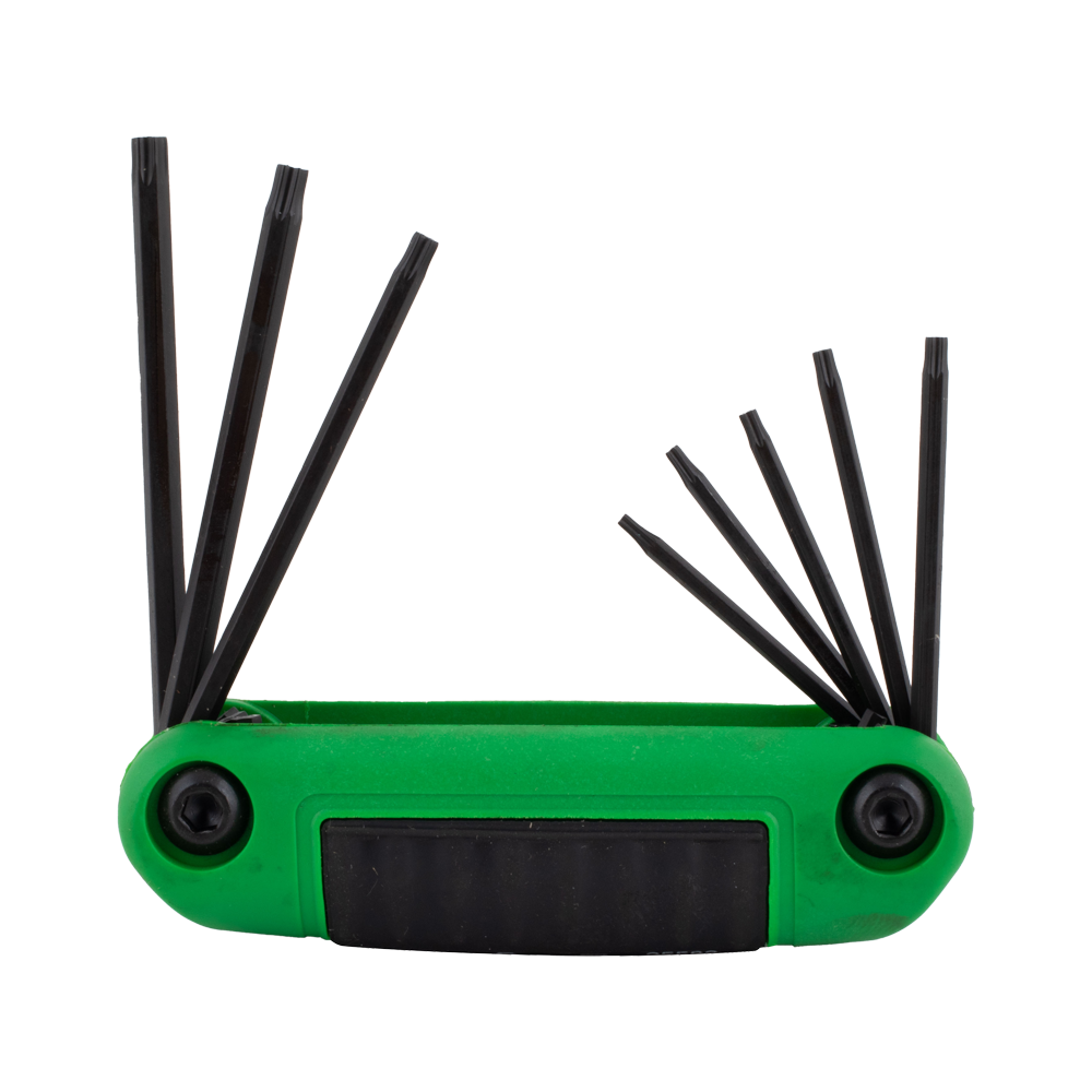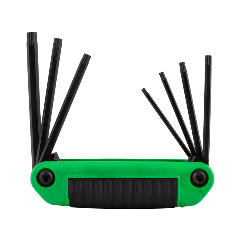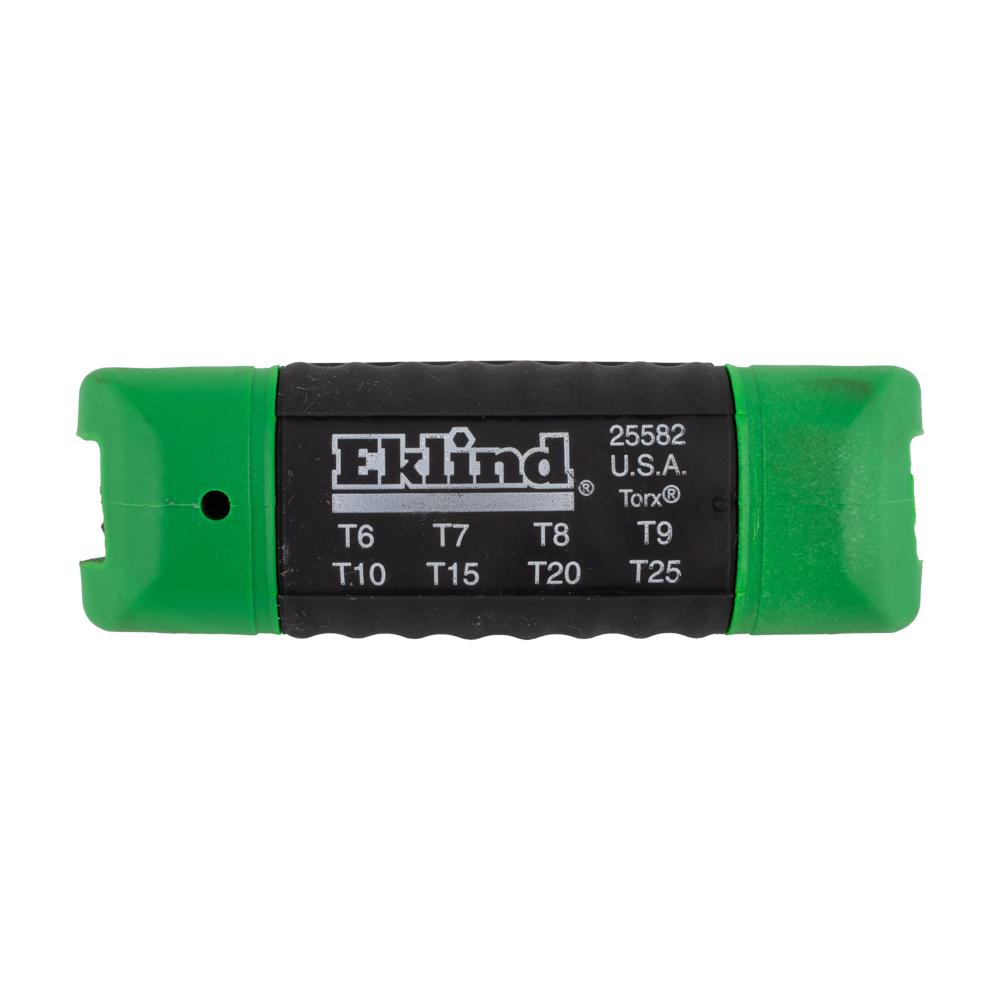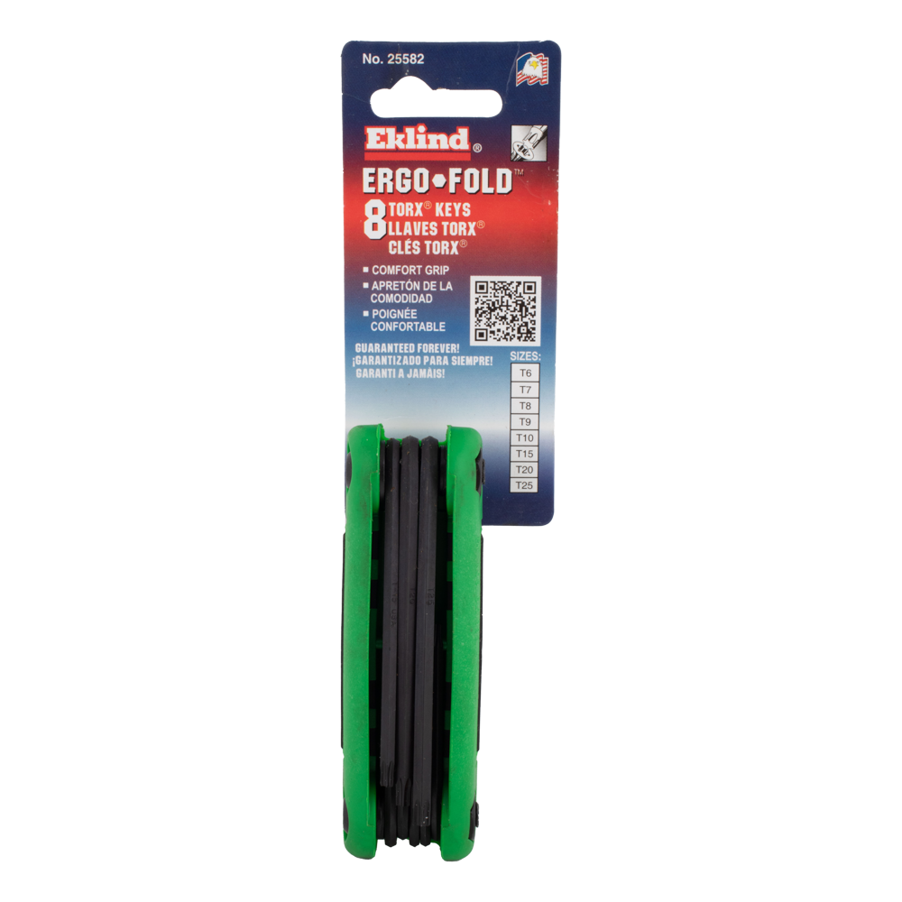 The Eklind Ergo-Fold™ Torx Key Set is made in the U.S.A. using high-quality Eklind® Alloy Steel, heat-treated for superior strength and ductility. With its Eklind® Black Finish, the set resists rust and wear. The fold-up design includes a variety of popular sizes in one convenient handle, preventing the loss of individual keys. Fold a key out to a right angle for maximum leverage or fully extend it to operate like a screwdriver. The ergonomic handle, featuring a hard plastic shell and soft over-mold, ensures comfort, slip resistance, and safety. The set is colour-coded green for torx sizes, offering an efficient tool solution.