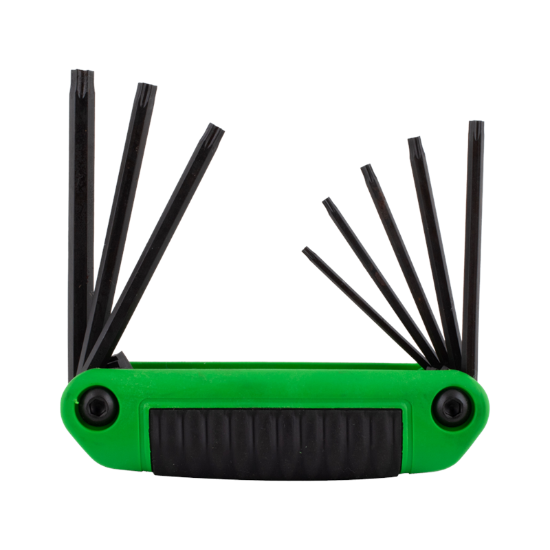 The Eklind Ergo-Fold™ Torx Key Set is made in the U.S.A. using high-quality Eklind® Alloy Steel, heat-treated for superior strength and ductility. With its Eklind® Black Finish, the set resists rust and wear. The fold-up design includes a variety of popular sizes in one convenient handle, preventing the loss of individual keys. Fold a key out to a right angle for maximum leverage or fully extend it to operate like a screwdriver. The ergonomic handle, featuring a hard plastic shell and soft over-mold, ensures comfort, slip resistance, and safety. The set is colour-coded green for torx sizes, offering an efficient tool solution.