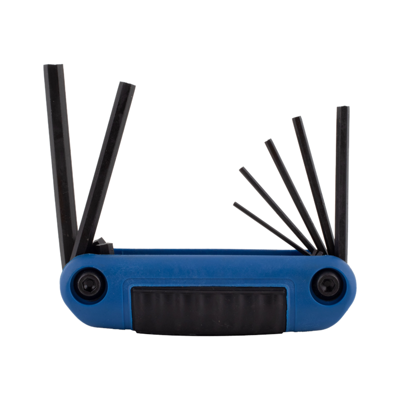 The Eklind Ergo-Fold™ Hex Key Set is made in the U.S.A. using high-quality Eklind® Alloy Steel, heat-treated for superior strength and ductility. With its Eklind® Black Finish, the set resists rust and wear. The fold-up design includes a variety of popular sizes in one convenient handle, preventing the loss of individual keys. Fold a key out to a right angle for maximum leverage or fully extend it to operate like a screwdriver. The ergonomic handle, featuring a hard plastic shell and soft over-mold, ensures comfort, slip resistance, and safety. The set is colour-coded red for imperial sizes, offering an efficient tool solution.
