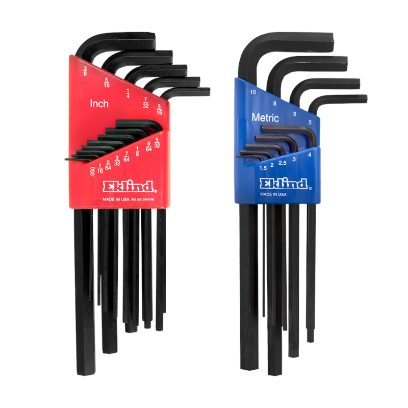 This Eklind Long Series Hex L-Key Set is crafted in the U.S.A. with Eklind® Alloy Steel, heat-treated for optimal strength and ductility. Finished with a durable Eklind® Black Finish, the set resists rust, ensuring long-lasting use. Color-coded in blue for metric sizes, it includes nine keys in sizes ranging from 1.5mm - 10mm. The plastic holder securely holds each key in a marked slot, providing easy access and organisation for professional-grade performance in industrial settings.