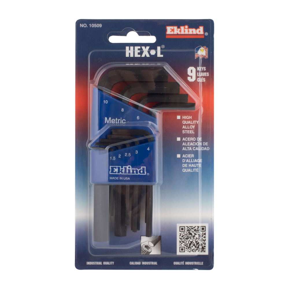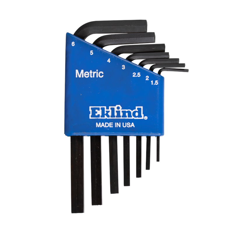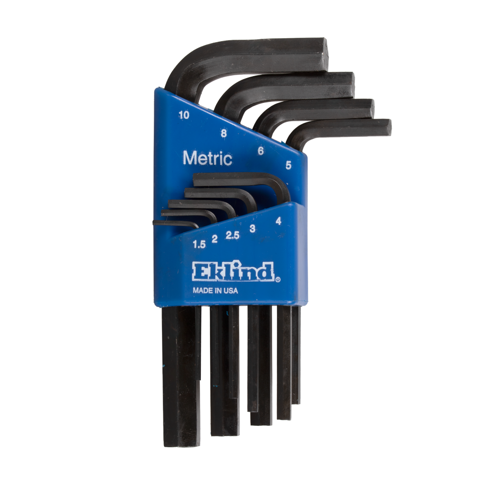 This Eklind Short Series Hex L-Key Set is crafted in the U.S.A. with Eklind® Alloy Steel, heat-treated for optimal strength and ductility. Finished with a durable Eklind® Black Finish, the set resists rust, ensuring long-lasting use. Color-coded in blue for metric sizes, it includes nine keys in sizes ranging from 1.5mm - 10mm. The plastic holder securely holds each key in a marked slot, providing easy access and organisation for professional-grade performance in industrial settings.