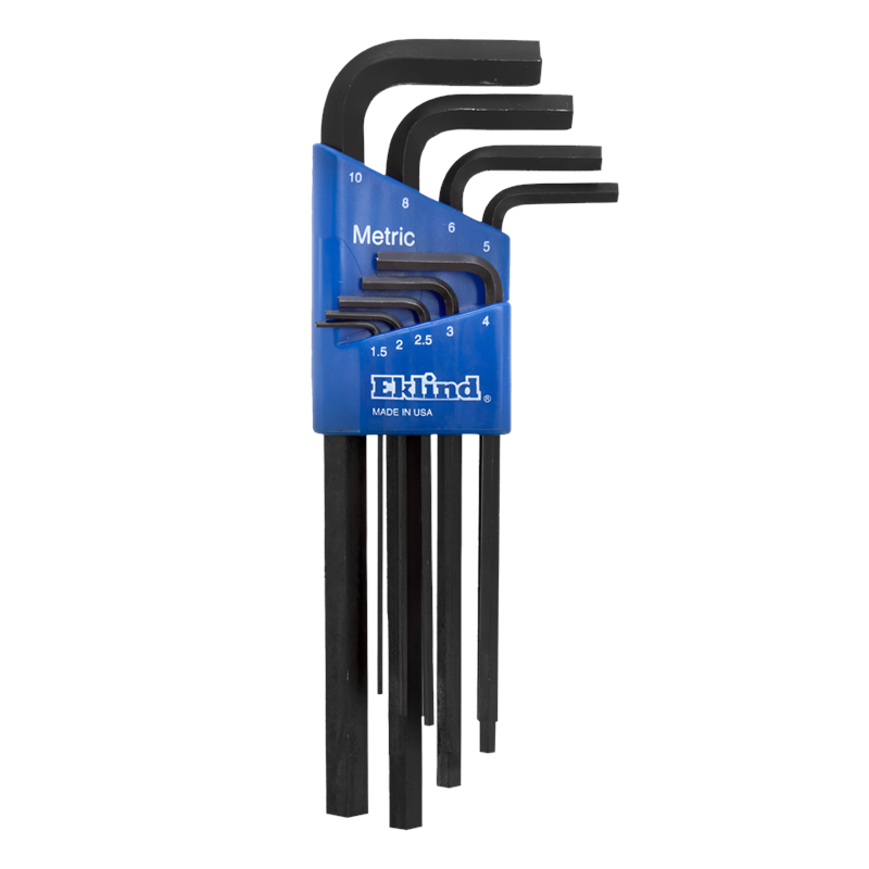 This Eklind Short Series Hex L-Key Set is crafted in the U.S.A. with Eklind® Alloy Steel, heat-treated for optimal strength and ductility. Finished with a durable Eklind® Black Finish, the set resists rust, ensuring long-lasting use. Color-coded in blue for metric sizes, it includes nine keys in sizes ranging from 1.5mm - 10mm. The plastic holder securely holds each key in a marked slot, providing easy access and organisation for professional-grade performance in industrial settings.