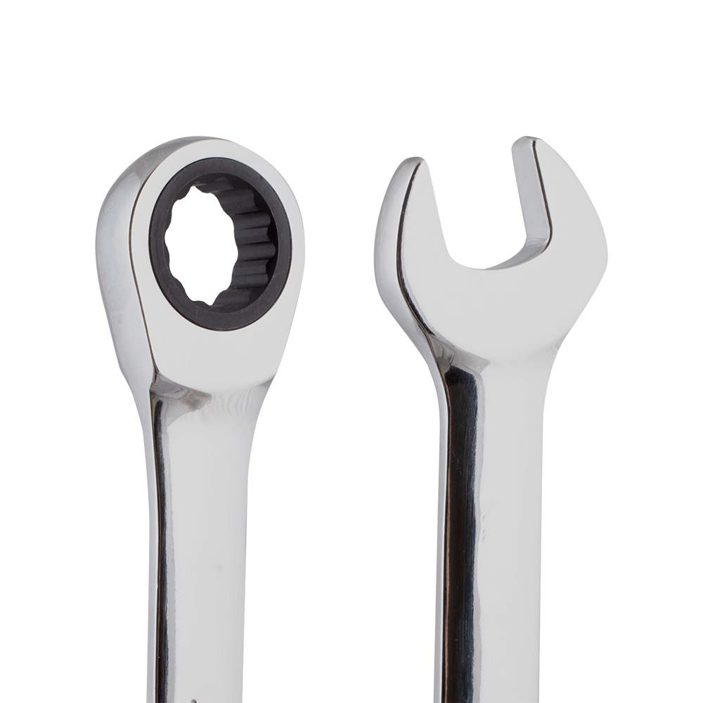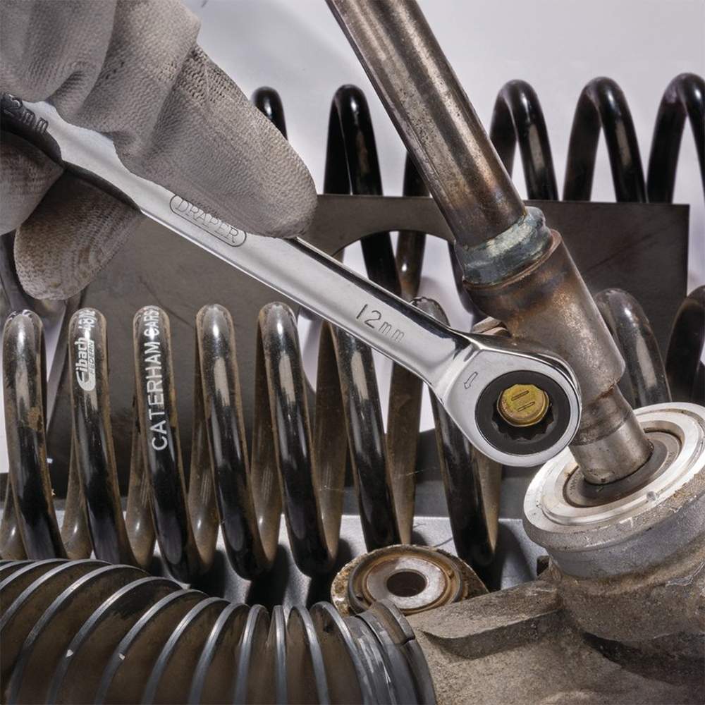The Draper HI-TORQ® Metric Ratcheting Combination Spanner Set exemplifies precision and efficiency in mechanical work. Crafted with expertise, the open end is intelligently set at a 15° angle, demanding merely a 5° movement to turn fasteners, a boon in confined spaces. The 90-tooth ratchet mechanism ensures seamless operation, while the chrome vanadium steel construction, forged with precision and hardened, guarantees durability. Fully polished and mirror chrome plated, these spanners exude a professional finish. The 12-point HI-TORQ® ring end ensures optimal leverage, enhancing the user's grip and control. This set, comprising seven spanners ranging from 8 to 19mm, is a testament to Draper's commitment to quality and functionality.
