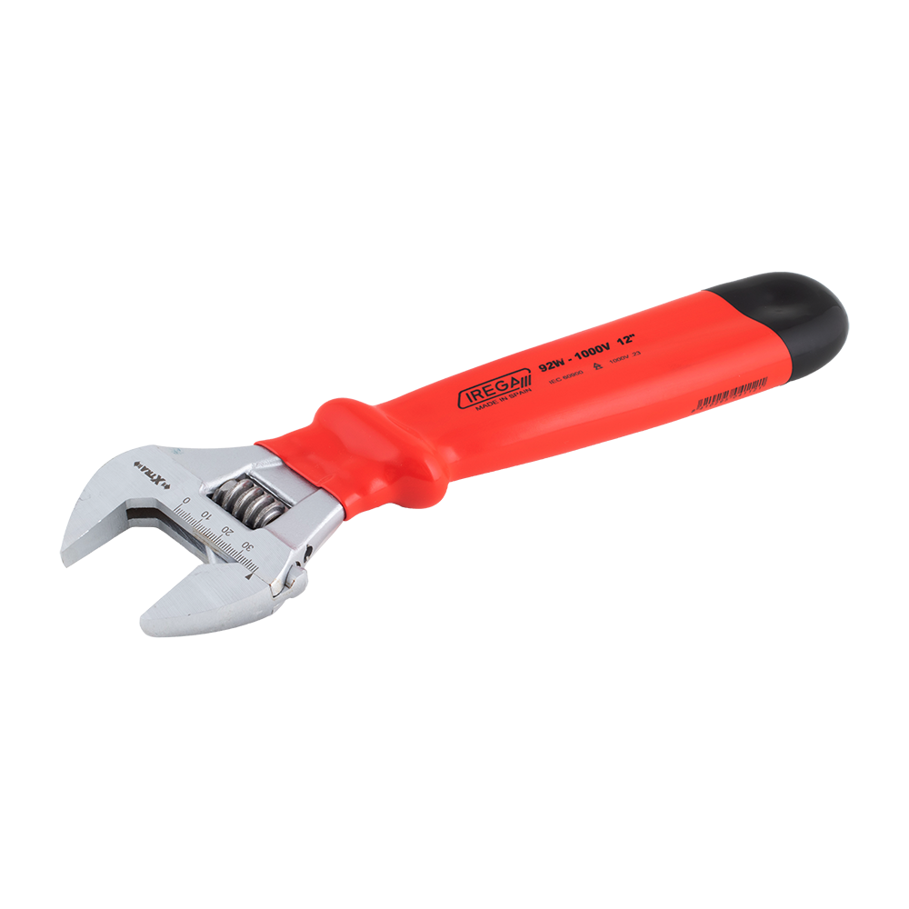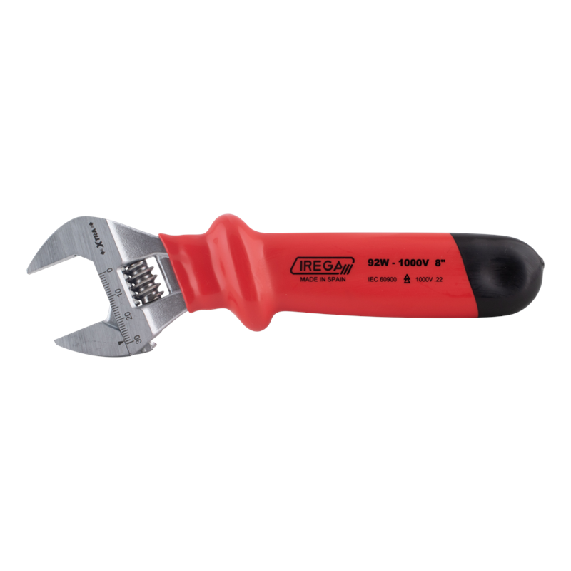 Introducing the Irega Adjustable Wrench with Insulated Handle, designed for tasks involving voltage or proximity to voltage installations at up to 1,000V AC and 1,500V DC. Available in sizes ranging from 6” to 12”, this model boasts an impressive 25% XTRA capacity, enabling operation across a broader spectrum of nuts and bolts without changing wrench sizes. Its four-thread knurl ensures a secure grip, while its lightweight and compact design delivers exceptional ergonomics and performance. The handle features three layers of “Plastisol” insulation in distinct colors - Red (SAFETY), Orange (CAUTION), and Yellow (STOP USING) - facilitating easy inspection of insulation condition. This flame-retardant, insulated material guarantees safety within temperatures spanning -20ºC to 70ºC. Crafted entirely in Spain, it’s a testament to quality and innovation.