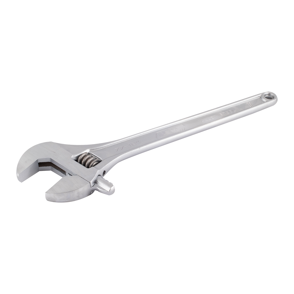 The Irega Model 77 Adjustable Wrench is the best value for money. Crafted from chrome alloy steel, it boasts durability that’s second to none. Its ergonomic handle ensures comfortable usage. With non-protruding jaw shanks and perfectly parallel jaw surfaces, it offers an impeccable grip on nuts. Thanks to precision-ground jaw slides, adjustments are smoother and more accurate. For extreme conditions, it offers double security with a threaded pin and visible stake. The chrome alloy steel construction ensures top-notch quality, enhanced by a triple-coated chrome finish for maximum rust resistance. Available in sizes ranging from 4” to 24”, each tool is meticulously inspected to guarantee total customer satisfaction. Manufactured according to the strictest international standards. 100% made in Spain.