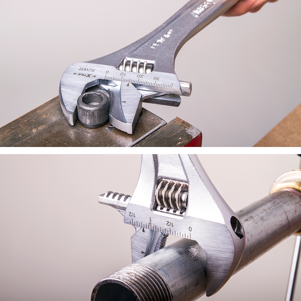 - Reversible Jaw and Xtra capacity allows for working with bigger diameter nuts and pipes with the same adjustable wrench.