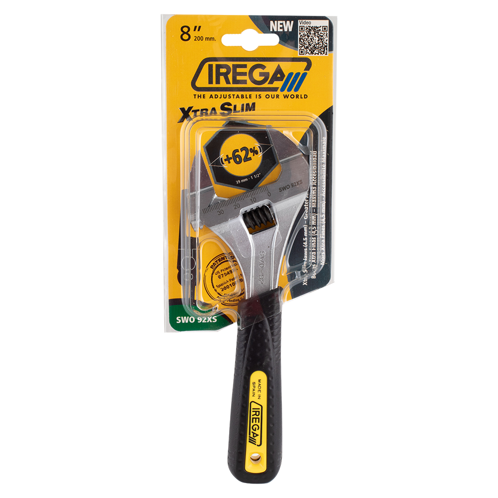 Experience unparalleled accessibility with the Irega Xtra Slim Super Wide Opening Adjustable Wrench. Its innovative Xtra Slim jaw design, up to 50% thinner than conventional wrenches, delivers greater maneuverability. The reduced thickness spans the full length of the jaws, ensuring the utmost accessibility. Crafted from robust Chrome Vanadium Steel, the wrench offers enduring performance. The ErgoTop ergonomic grip, situated above a full handle, is both comfortable and replaceable. Boasting a non-protruding jaw shank at maximum opening, it excels in plumbing, heating, air conditioning, refrigeration, and maintenance tasks. This 8” wrench showcases a 39mm opening, 62% wider, with a weight of just 335g. Securely blister packed, this high-performance universal tool redefines accessibility and efficiency. IREGA 100% Quality assured.