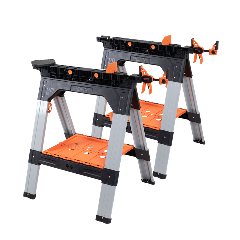Pony’s convenient 2‑in‑1 worktable and sawhorse makes for quick and easy conversion for tackling many projects. Works with the Medium-duty E‑Z Hold® bar clamps, they can be fastened directly to the worktable / sawhorse, as well as hold items vertically or horizontally for greater flexibility while you work. Thanks to its hassle‑free breakdown and folding mechanism, this table is easy to transport and store away. In addition, the 6 positions height‑adjusting feature allows you to adapt to any size project, enabling you to work at different levels. A built‑in shelf provides storage for tools and materials, saving space and keeping everything close by.