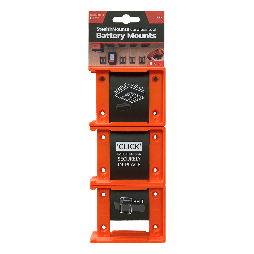 StealthMounts Battery Mounts for Hilti cordless batteries keep your batteries organised and exactly where you need them. Batteries fit by ‘clicking’ into the holder and are only released by pressing the release button on the battery. Batteries can be held at any angle locked in the holder and will not fall out even whilst travelling. Perfect for mobile setups or workshops! Manufactured in the United Kingdom our Hilti Battery Mounts are made using extremely durable injection moulded ABS plastic with countersunk screw holes to allow for firm mounting on multiple surfaces. Great for keeping track of your batteries and staying organised. They can be mounted at any distance from one another and in tight spaces for maximum workshop efficiency. Mount them in your workshop, under shelves, toolboxes, tool trailers or in your work vehicles with due care. They can also be looped through a belt for use on the job site. StealthMounts Battery Mounts are available colour coded to match your Hilti platform.