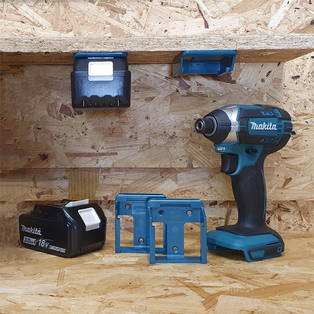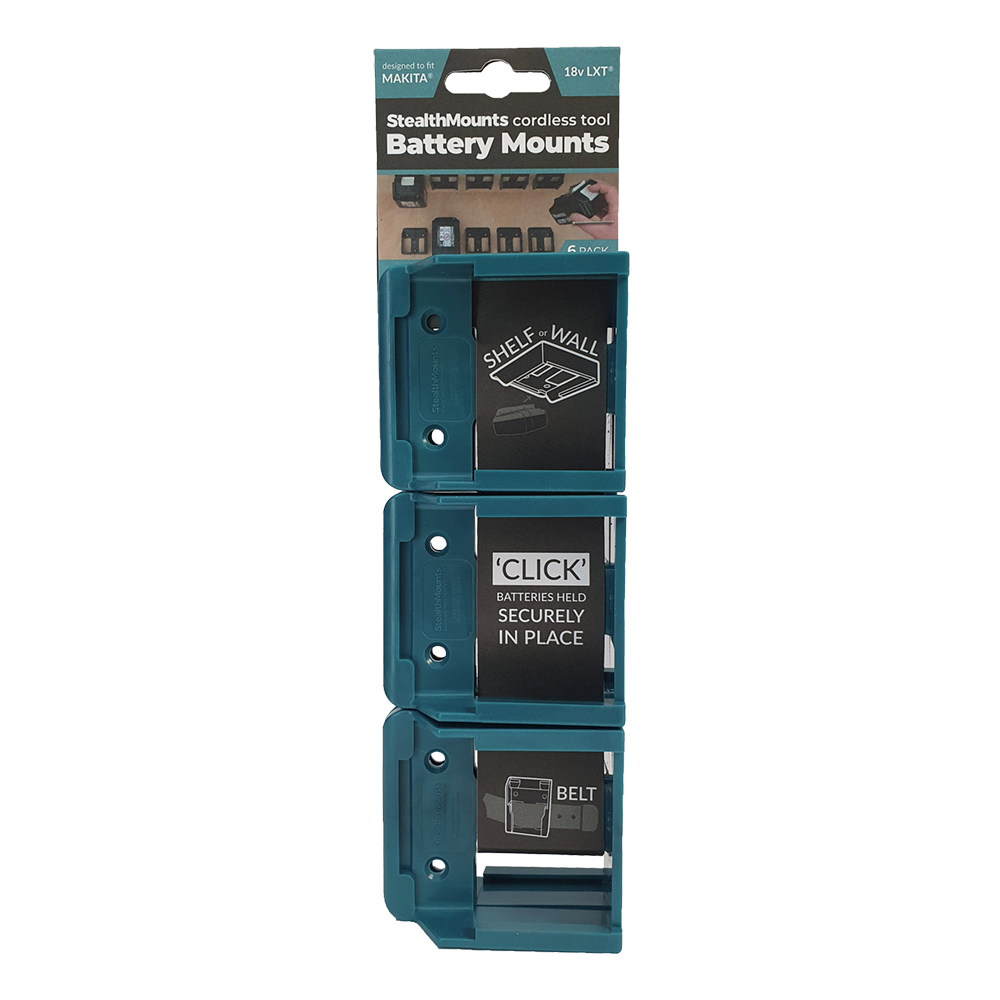 StealthMounts Battery Mounts for Makita 18v LXT cordless batteries keep your batteries organised and exactly where you need them. Batteries fit by clicking into the holder and are only released by pressing the release button on the battery. Batteries can be held at any angle locked in the holder and will not fall out even whilst travelling. Perfect for mobile setups or workshops! Manufactured in the United Kingdom our Makita 18v LXTBattery Mounts are made using extremely durable injection moulded ABS plastic with countersunk screw holes to allow for firm mounting on multiple surfaces. Great for keeping track of your batteries and staying organised. They can be mounted at any distance from one another and in tight spaces for maximum workshop efficiency. Mount them in your workshop, under shelves, toolboxes, tool trailers or in your work vehicles with due care. They can also be looped through a belt for use on the job site. StealthMounts Battery Mounts are available colour coded to match your Makita platform.