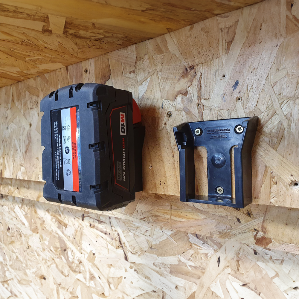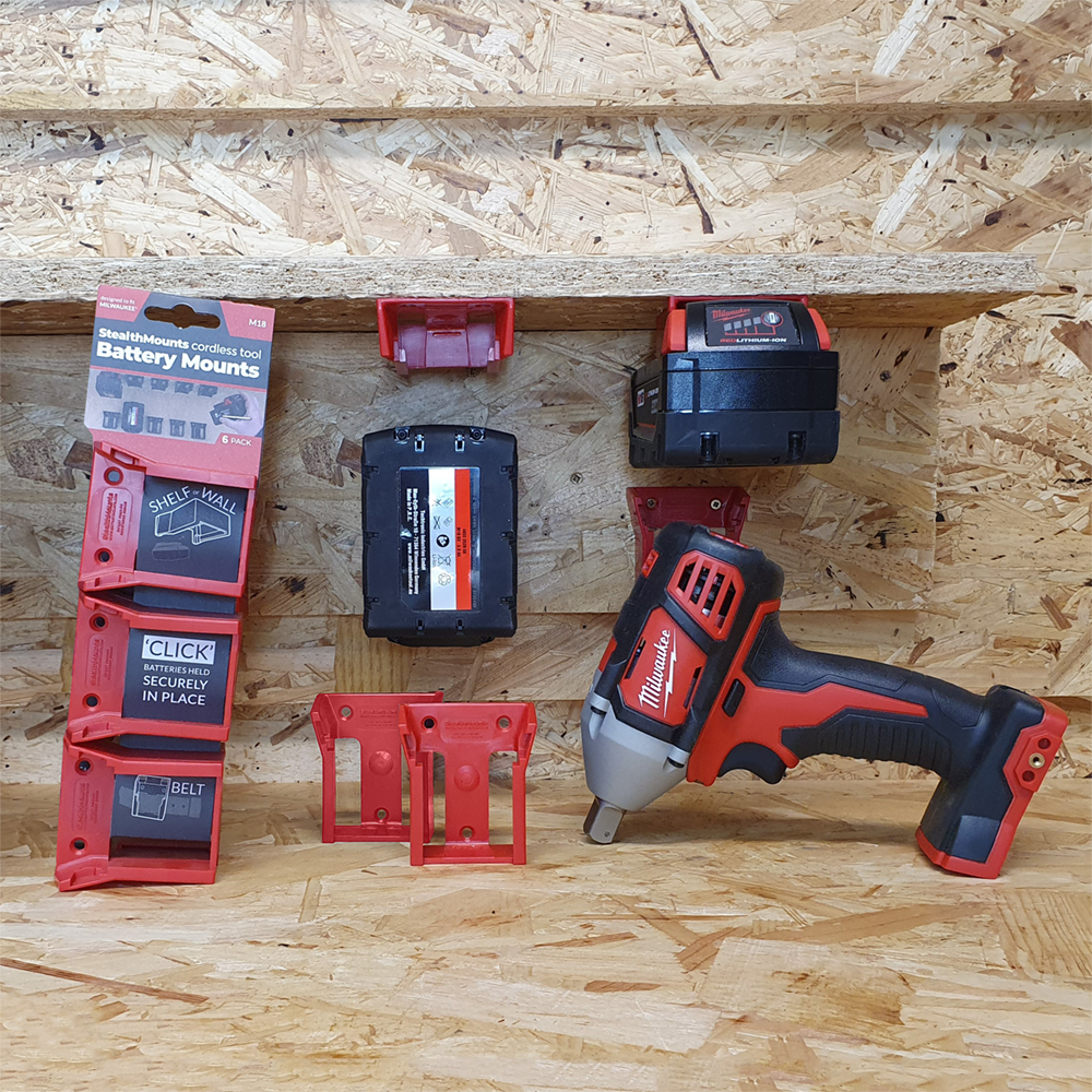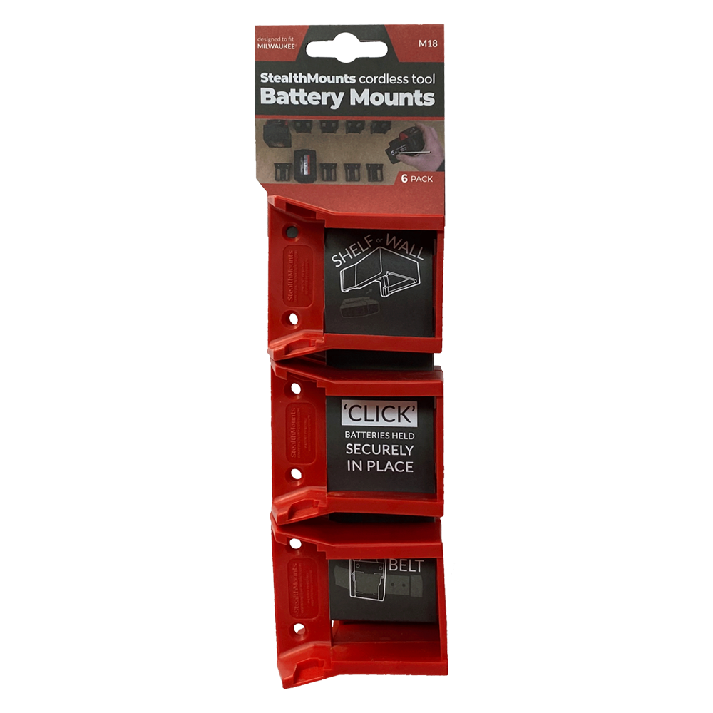 StealthMounts Battery Mounts for Milwaukee M18 cordless batteries keep your batteries organised and exactly where you need them. Batteries fit by clicking into the holder and are only released by pressing the release button on the battery. Batteries can be held at any angle locked in the holder and will not fall out even whilst travelling. Perfect for mobile setups or workshops! Manufactured in the United Kingdom our Milwaukee M18 Battery Mounts are made using extremely durable injection moulded ABS plastic with countersunk screw holes to allow for firm mounting on multiple surfaces. Great for keeping track of your batteries and staying organised. They can be mounted at any distance from one another and in tight spaces for maximum workshop efficiency. Mount them in your workshop, under shelves, toolboxes, tool trailers or in your work vehicles with due care. They can also be looped through a belt for use on the job site. StealthMounts Battery Mounts are available colour coded to match your Milwaukee platform.