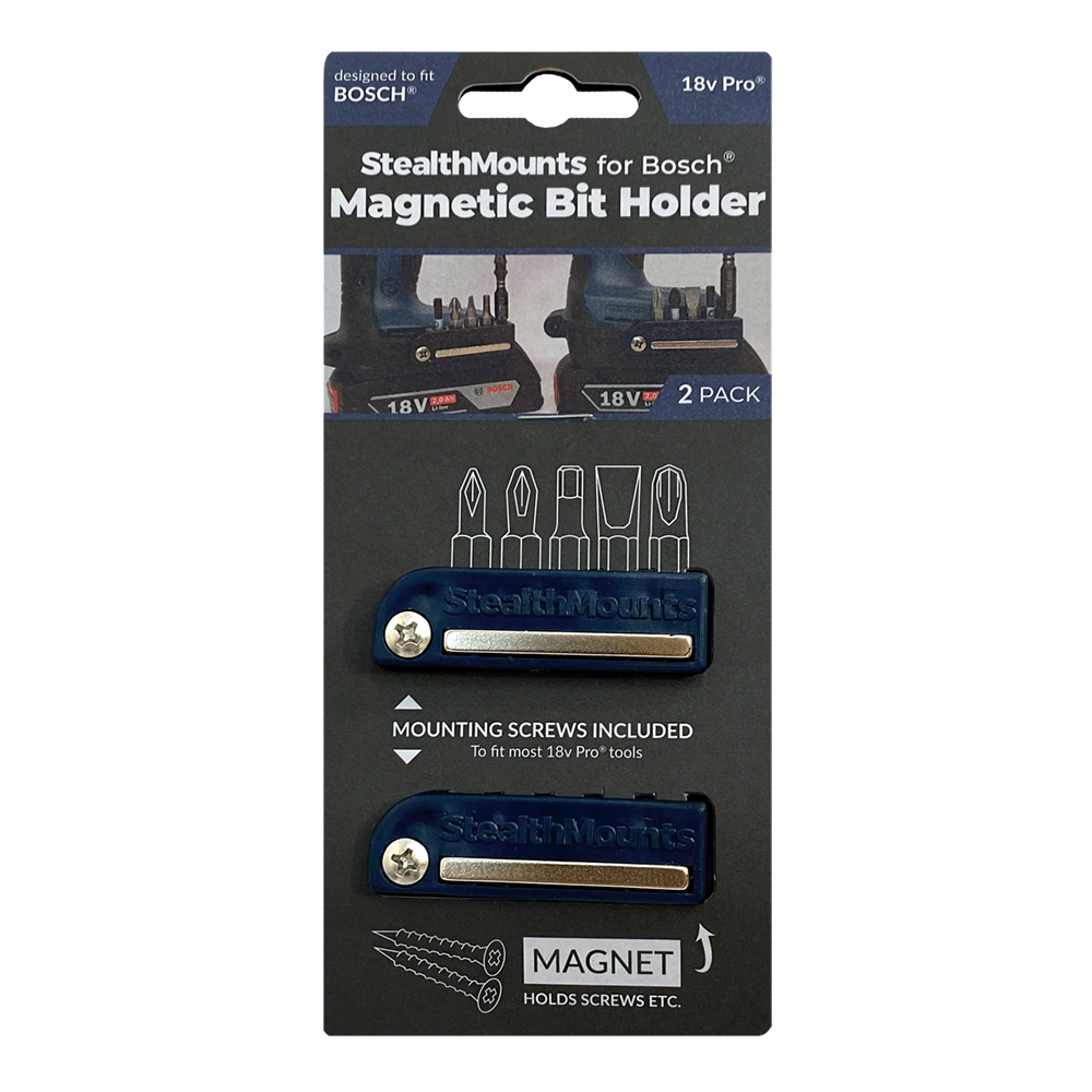 StealthMounts Bit Holders for Bosch ProCore & Professional are the perfect addition for your drill or impact driver. This bitholder keeps your bits together, organised and on your drill or impact driver. Our Bosch ProCore & Professional Bit Holders come in a pack of 2. Each magnetic bitholder can hold up to 5 bits allowing you to access your most common drill bits ensuring that you never lose track of them. The appropriate screw for mounting to most of your Bosch ProCore & Professional tools is provided. The magnet allows the bitholder to be mounted to the tool at different angles, extra screws can also be stored on the side of the magnet. Bits wont fall out even when the holder is mounted upside down. Made in Great Britain our Bosch ProCore & Professional Bit Holders are made with extremely durable injection moulded ABS plastic.