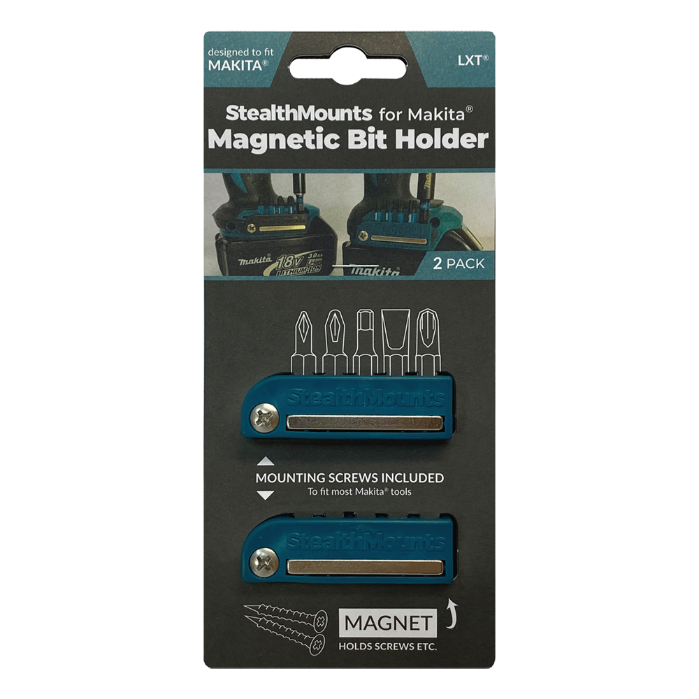 StealthMounts Bit Holders for Makita LXT & XGT are the perfect addition for your drill or impact driver.This bitholder keeps your bits together, organised and on your drill or impact driver. Our Makita LXT & XGT Bit Holders come in a pack of 2. Each magnetic bitholder can hold up to 5 bits allowing you to access your most common drill bits ensuring that you never lose track of them. The appropriate screw for mounting to most of your Makita LXT & XGT tools is provided. The magnet allows the bitholder to be mounted to the tool at different angles, extra screws can also be stored on the side of the magnet. Bits wont fall out even when the holder is mounted upside down. Made in Great Britain our Makita LXT & XGT Bit Holders are made with extremely durable injection moulded ABS plastic.