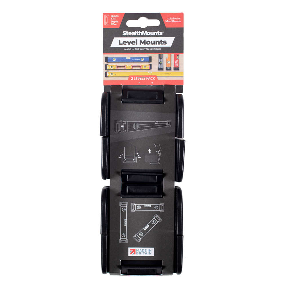 StealthMounts Level Mounts are universal holders that will fit 90% of levels on the market (maximum height of 64mm (2 7/16) and a maximum depth of 32mm (1 ΒΌ). StealthMounts Universal Level Holders are compatible with many top brand levels including: Stabila, Empire, SOLA, Milwaukee, Stanley, Stanley FatMax, DeWalt, Irwin plus many more. This allows you to keep your levels organised and easily accessible within your workshop. The universal Level Mounts can be mounted to any surface with screws without allowing excessive level movement. Each pack contains 2 sets of Universal Level Mounts. StealthMounts Level Mounts can be held vertically or horizontally. Made in Great Britain our Level Mounts are made with extremely durable injection moulded ABS plastic with countersunk screw holes to allow for firm mounting.