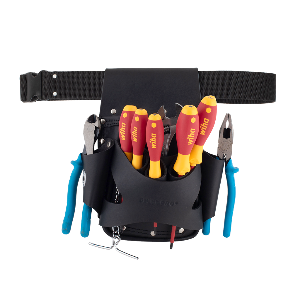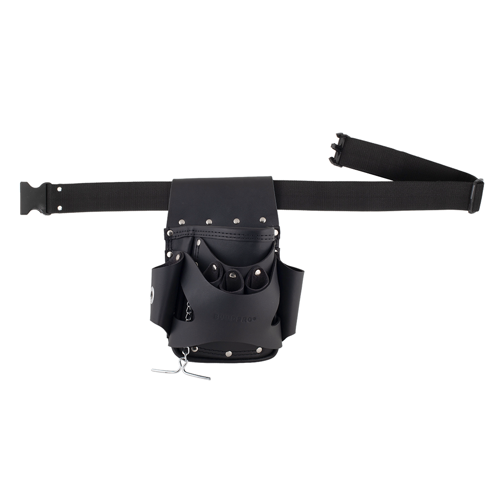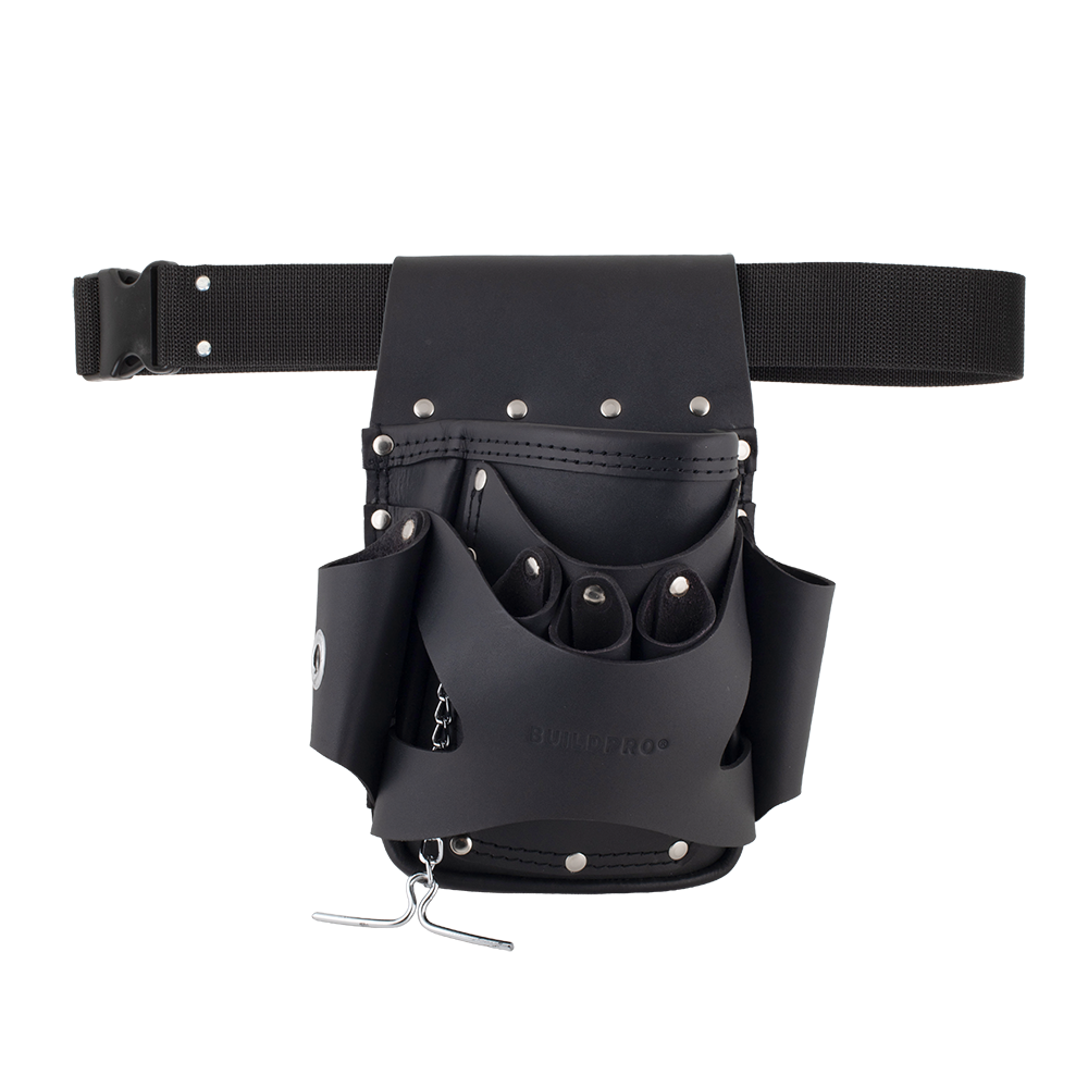 The BuildPro Leather Electricians Pouch is a super-robust tool storage solution for professional sparkies. Constructed from high-quality full-grain leather with double-stitched poly thread and heavy-duty rivets for lasting durability. It features two main pockets, multiple smaller tool holders, and a strong chain hook to secure essential gear on the job. Supplied with an adjustable 50mm nylon web belt. The pouch is also compatible with BuildPro leather belts and the BackPro Belt.