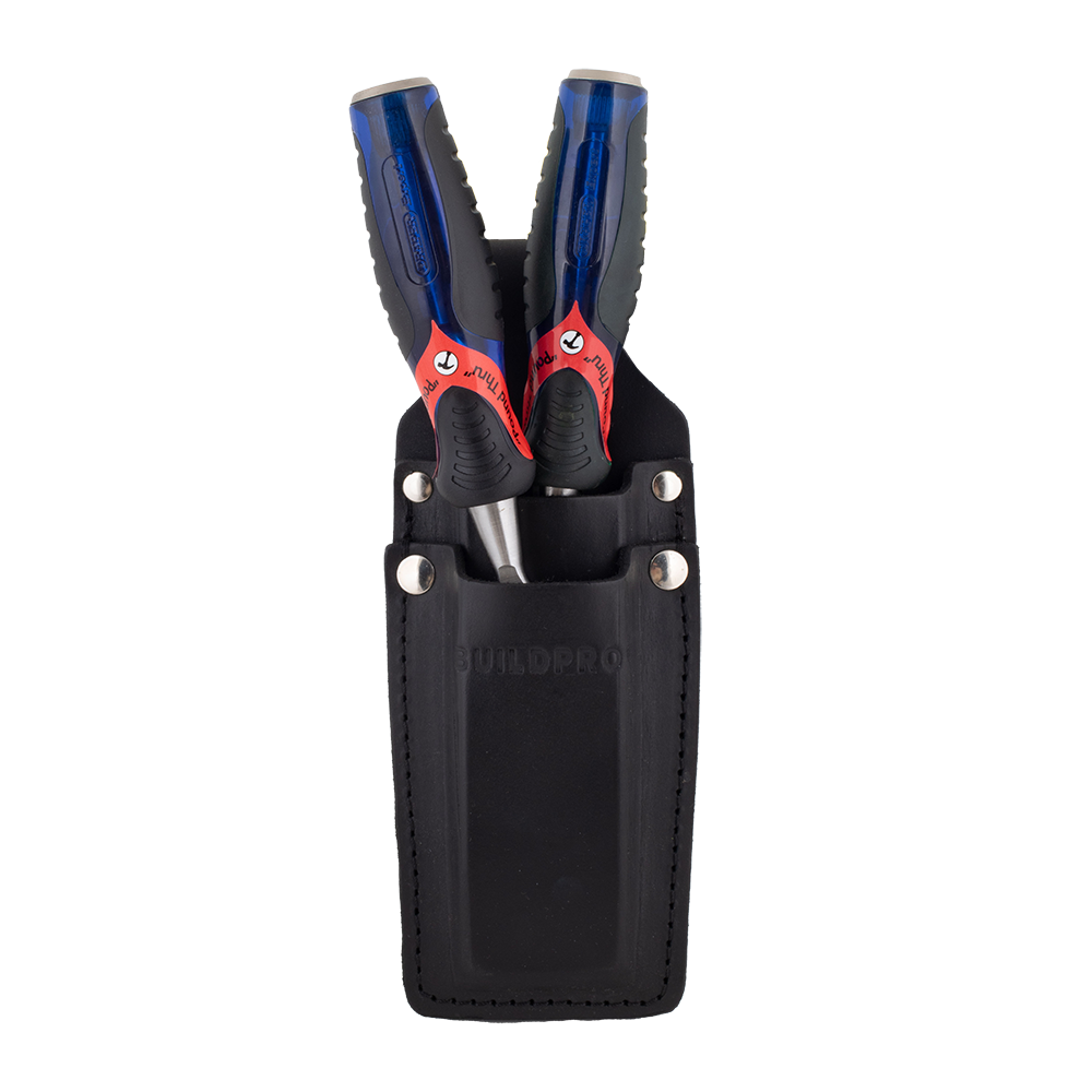 The Buildpro Double Chisel Holder is crafted from thick, full-grain premium leather for superior durability. Wet-molded to retain its shape, it securely holds chisels in place, with internal reinforcement to prevent cutting through. Heavy-duty poly-thread stitching and robust German or Italian rivets ensure long-lasting strength. Each piece is hand-finished, edge-dyed, and individually inspected for quality. Built for professionals, this chisel holder offers reliable performance with minimal fuss, making it a must-have for tradespeople who demand the best.