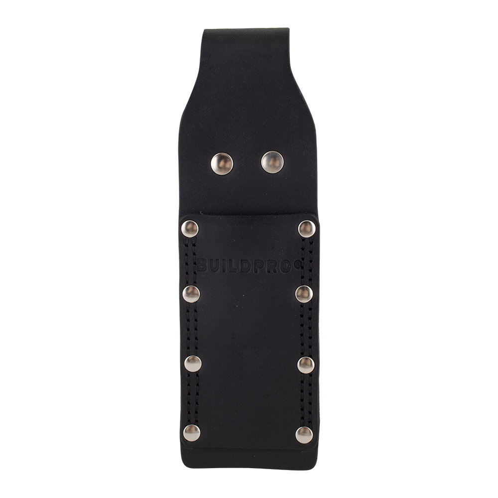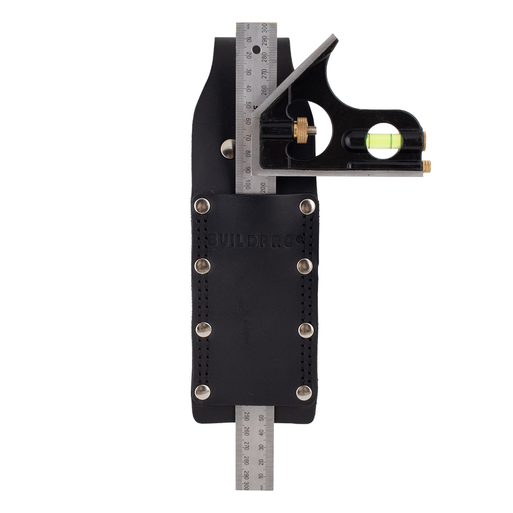 The Buildpro Square Holder is crafted from thick, premium full-grain leather, ensuring long-lasting durability. Designed to hold your combination square securely, it features heavy-duty poly-thread stitching and German/Italian rivets that are pressure-fitted for added strength. Each holder is hand edge-dyed and hand-finished to ensure a refined look and feel. Individually inspected for quality, this holder provides reliable tool storage and easy access.